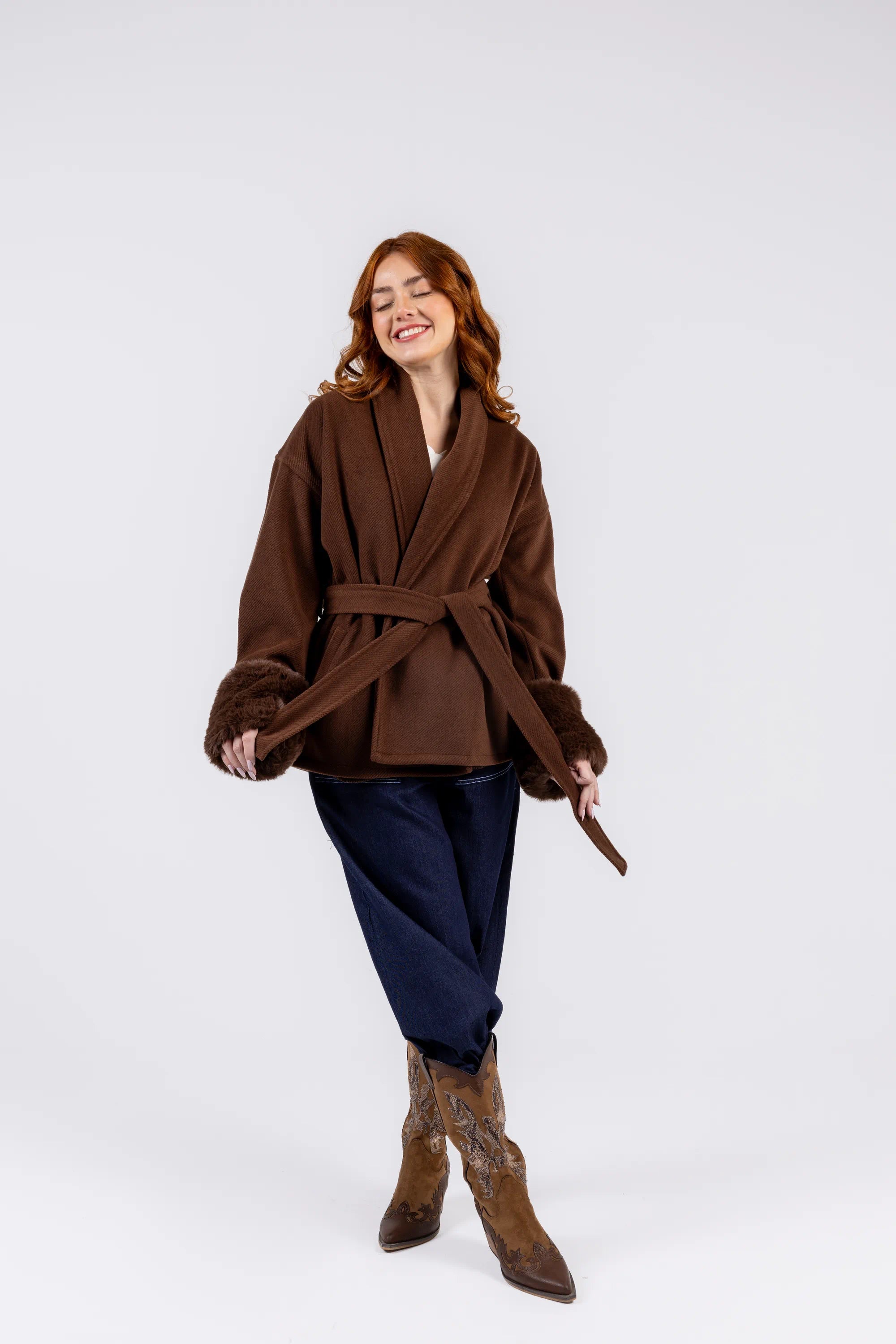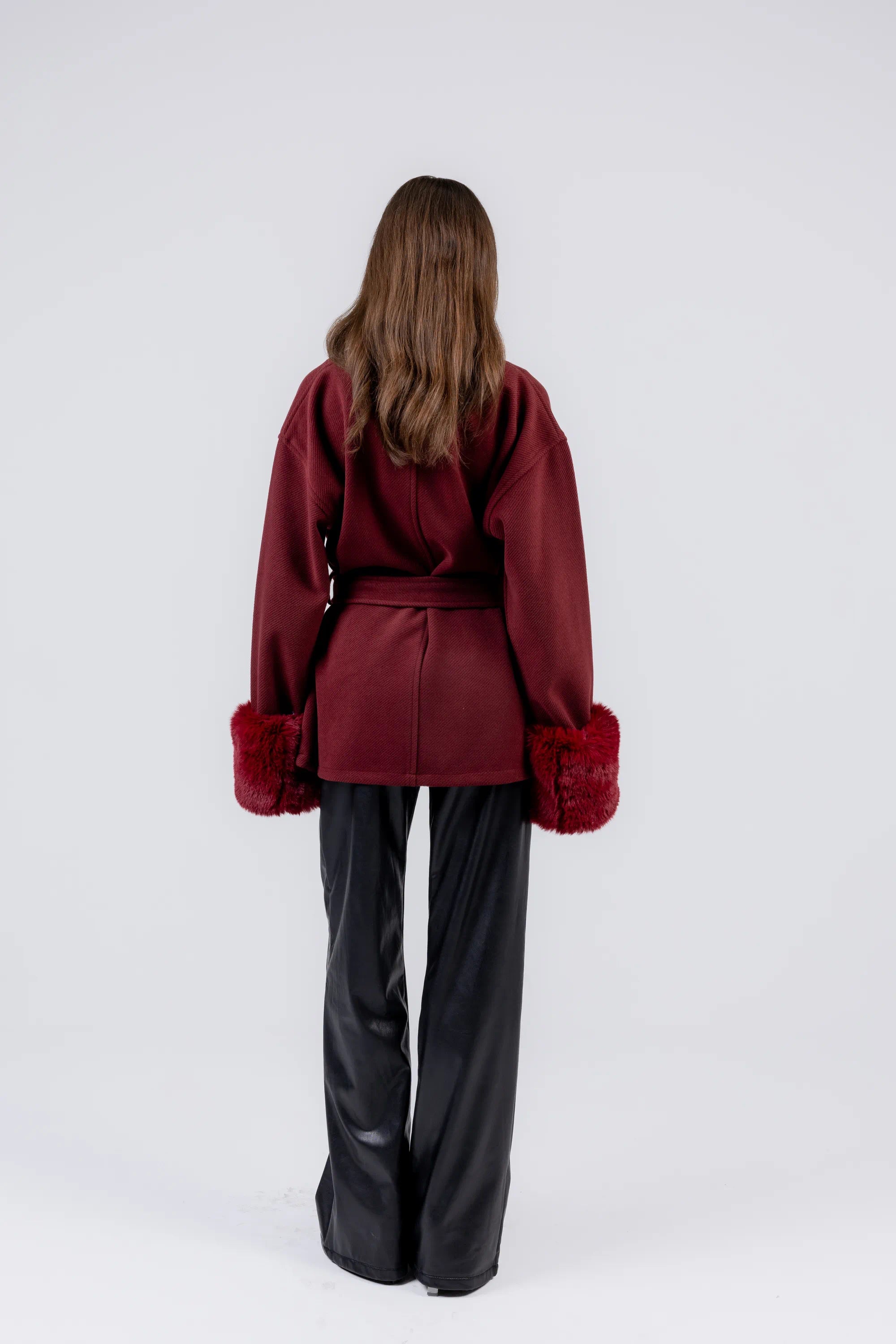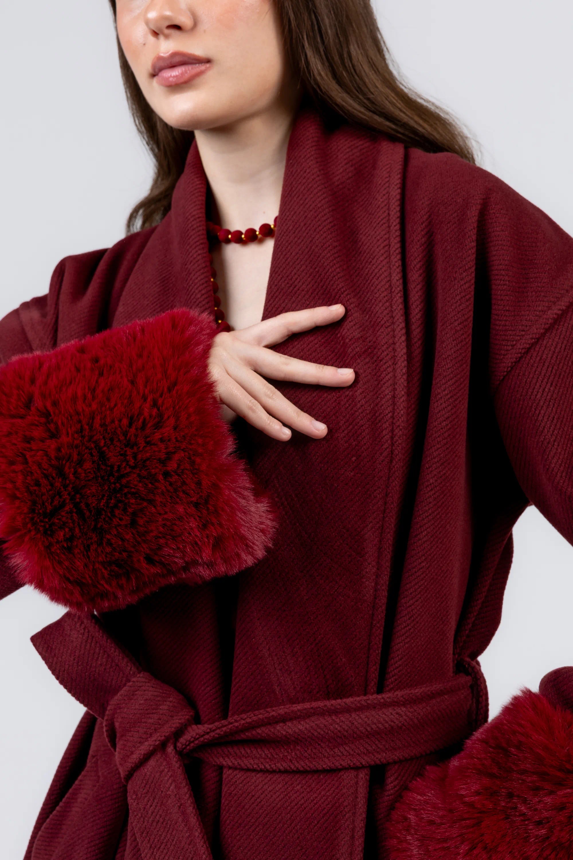 The Warmth Coat is made from heavy wool with fur details, designed in a relaxed, belted silhouette. A cozy statement piece that brings warmth and effortless elegance to your look.